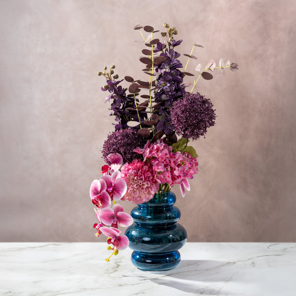 The Midnight Orchid is an exquisite artificial arrangement that brings a touch of dramatic, moody elegance to any setting. This sophisticated display features a cascading trail of stunning Phalaenopsis Orchids in deep magenta and pink tones, perfectly complemented by the spherical texture of dark purple Allium blooms. The design is filled out with a lush gathering of ruffled Hydrangeas and a striking Dahlia focal point, while dark-leafed Eucalyptus stems and tall, purple Delphiniums provide height and a modern, airy silhouette.