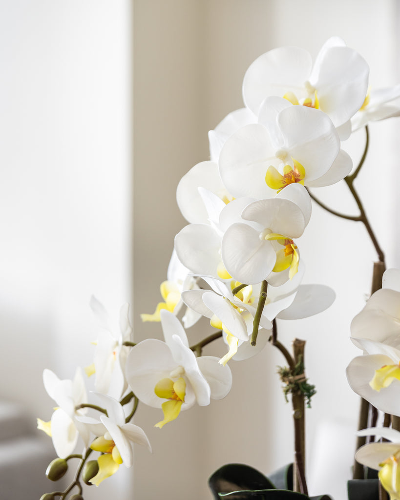 Looking for a gold Spark to redesign your space? This lifelike artificial orchid flower arrangement is a perfect choice. Assembled using three real-touch orchid flowers and orchid green leaves.