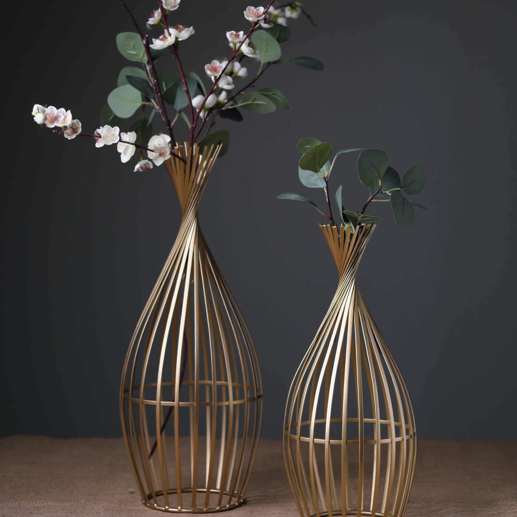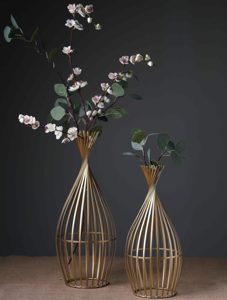 This unique twisted vase set is constructed from gently twisting matte gold wire creating a stunning effect. It is a simple design but makes a fabulous floor-standing floral display.