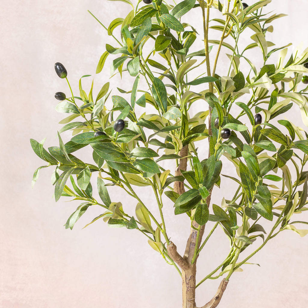 What sets our artificial Olive Tree apart is the inclusion of olives, further enhancing its realistic charm. The presence of these faux olives adds a touch of Mediterranean allure, making it a delightful addition to any interior landscape. Crafted with meticulous attention to detail, this lifelike tree boasts a realistic artificial trunk.