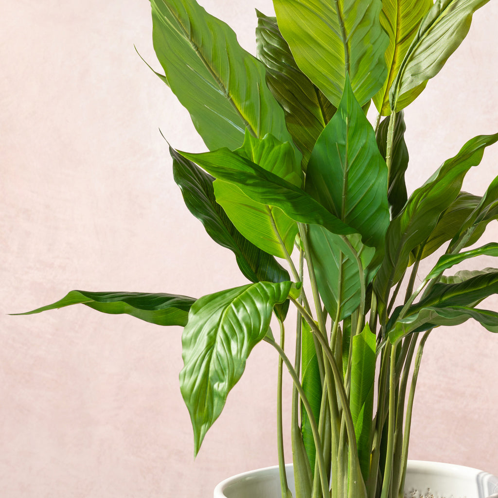 This Faux Peace Lily Plant brings serene elegance with its glossy, dark green leaves and a striking white bloom. It provides a classic, lush look and soothing ambiance without any light or watering needs, making it a perfect, maintenance-free accent for any room.