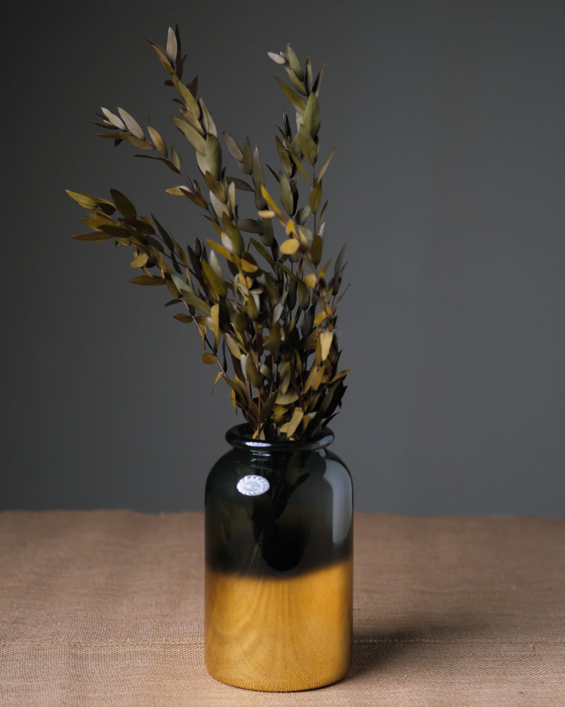 This elegant vase is made of dark greenish-black glass and is Ambered with a reflective gold base.